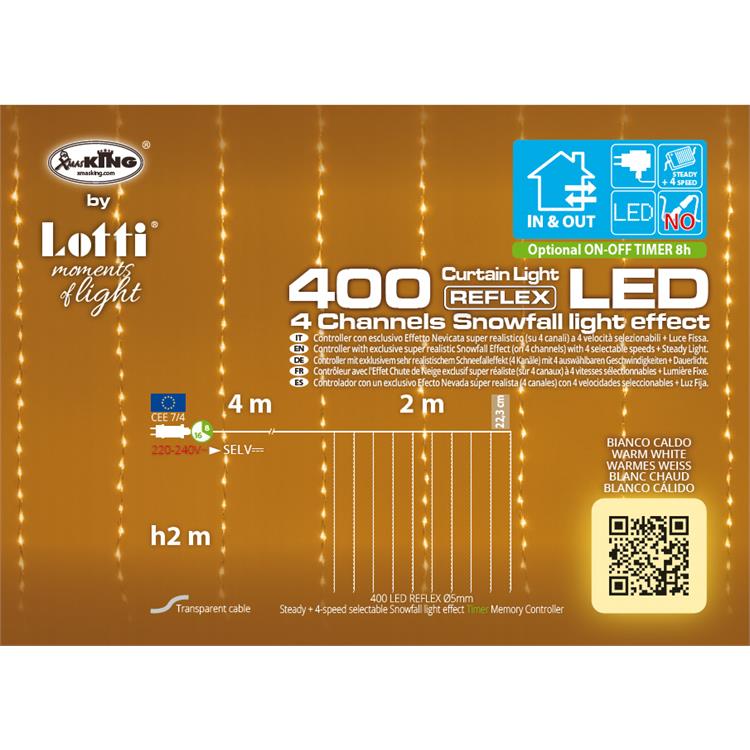La tenda luminosa Snow Light, caratterizzata da 10 stringhe per un totale di 400 LED, crea un'atmosfera magica e accogliente, perfetta per accendere la magia del Natale. Grazie al Memory Controller puoi scegliere tra luce fissa o effetto nevicata 4 velocità (4 Canali) personalizzando l'effetto nevicata, scegliendo tra diverse velocità e intensità.