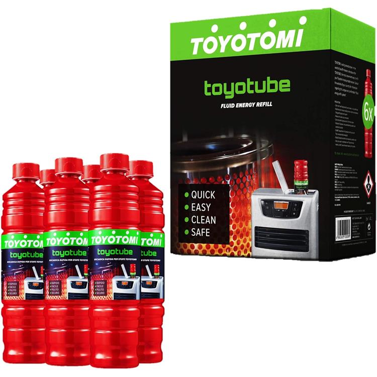 Ricarica rapida per stufe Toyotomi. 6 bottiglie di combustibile puro per la tua stufa. Prestazioni ottimali, inodore e un alta resa grazie ad un potere calorifico elevato. Lo trovi oggi in offerta ad un prezzo speciale solo da Kreo Brico&Casa! Da TOYOTOMI, primo produttore al mondo di stufe a combustibile, TOYOTUBE, il modo più semplice e sicuro per ricaricare la tua stufa portatile Toyotomi. E' semplice e sicuro da usare, si inserisce con una mano all'interno della stufa. Non farete più complicate operazioni di travaso, non userete più la pompetta, Nessun contatto con il combustibile, Mani pulite, pavimento pulito. La pratica confezione da 6 bottiglie permette al consumatore un facile trasporto, il contenuto sigillato di ogni singola carica assicura una migliore qualità del combustibile, che non entra a contatto con agenti esterni. La speciale formula "Ultra-Puro", grazie al basso contenuto di aromatici (0.006%): abbatte sensibilmente l'odore in accensione ed in spegnimento, il potere calorifico superiore a 11.400Kcal per ogni Kg, garantisce un elevata resa assieme ad una stabilità di fiamma ed assenza d'incombusti. Raccogliete i punti fedeltà e scoprite come estendere la garanzia della vostra stufa prodotta da Toyotomi. Tanica PET riciclabile 100%, tappo salvabimbo. Raccomandato da Toyotomi, da oltre 65 anni il primo produttore al mondo di stufe a combustibile *Adatto esclusivamente per per stufe a marchio. Zibro, Toyoset e Kerosun. Non usare con stufe di altri marchi. TOYOTOMI è il produttore leader mondiale delle famose stufe portatili ZIBRO, oltre 65 anni d'esperienza nella progettazione e produzione di stufe portatili a combustibile hanno permesso di sviluppare dei combustibili universali adatti per tutte le stufe, sicuri, inodori, efficienti e che permettano un uso duraturo della vostra stufa. Vi raccomandiamo di usare combustibili a marchio TOYOTOMI poiché rappresentano il meglio di quanto la tecnologia sui fluidi da riscaldamento possa mettere a disposizione: 4 formule appositamente studiate per esaltare le performance di tutte le stufe in una pratica ed ecologica tanica in PET riciclabile: TOYOTOMI PLUS: combustibile Puro, prezzo imbattibile per prestazioni ottimali. TOYOTOMI MAX: combustibile Super Puro, convenienza e super efficienza. Toyotomi PRIME: combustibile Inodore, prestazioni al top senza compromessi. TOYOTOMI CLEAR: combustibile Ultra inodore, in assoluto il migliore, puro per performance imbattibili.