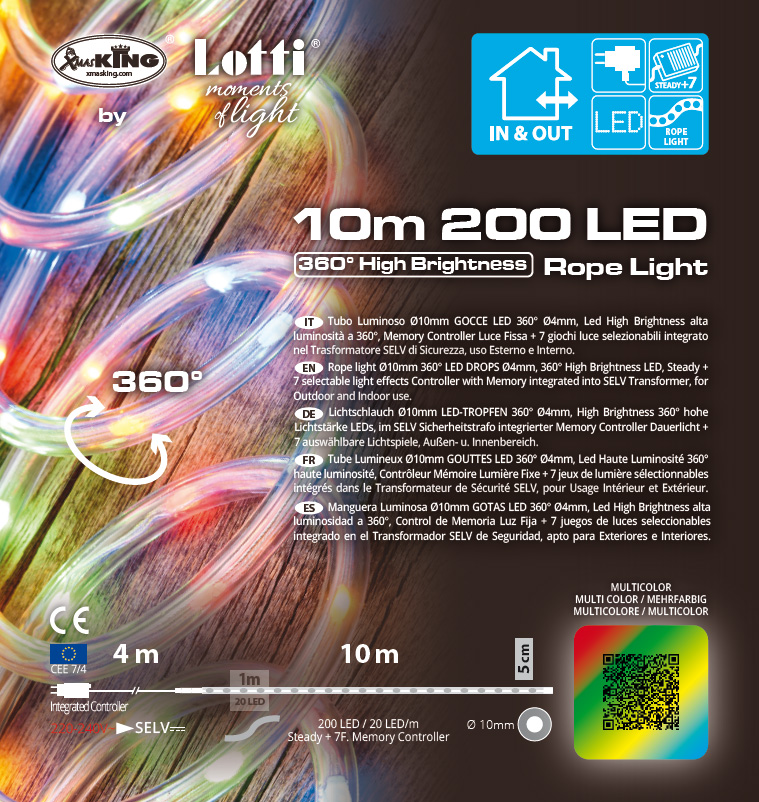 Il tubo luminoso LED è composto da 200 gocce LED 360° MULTICOLOR ø4mm che emettono una luce intensa e brillante a 360°, creando un effetto luminoso uniforme e coinvolgente.