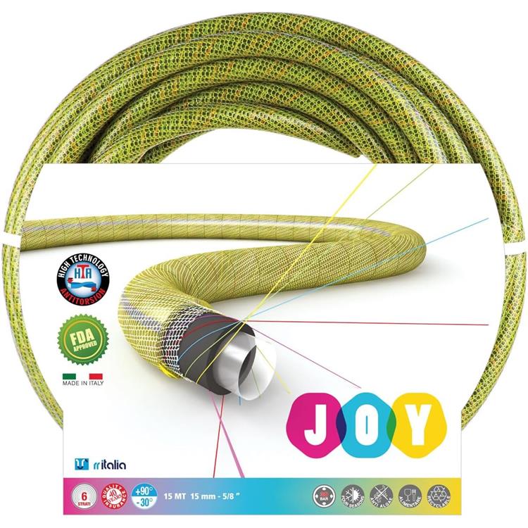 Realizzato con una tecnologia all'avanguardia, il tubo Joy Yellow è composto da 6 strati, con un rinforzo magliato Tricot HTA che lo rende estremamente resistente alla torsione. Primo strato interno in Poliuretano ad altissima elasticità conforme alle direttive EU 10/2011 per il passaggio di liquidi alimentari Simulanti A, B, C, D1. Strato in TPU, materiale termoplastico estremamente reattivo ed elastico. Strato in Evaliquido, per garantire un'altissima adesione tra gli strati. Fili antitorsione in 5 colori. Magliatura antitorsione NUOVO HTA che conferisce le proprietà di ANTITORSIONE e ANTINODO. Copertura anti UV con proprietà antialga.