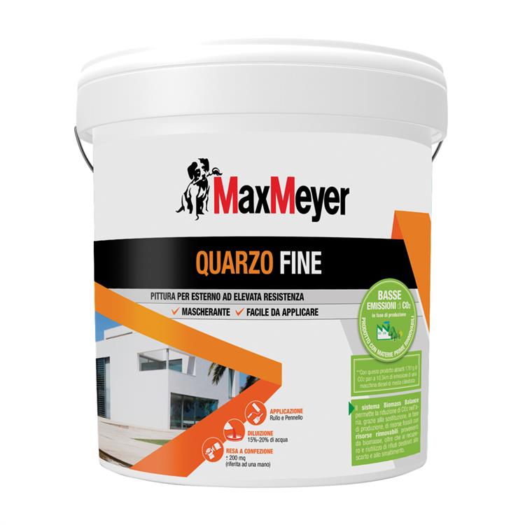 Questa è una pittura per esterni di alta qualità della linea Max Meyer, specificamente il modello Quarzo Fine. È progettata per offrire una finitura professionale e duratura sulle facciate degli edifici.